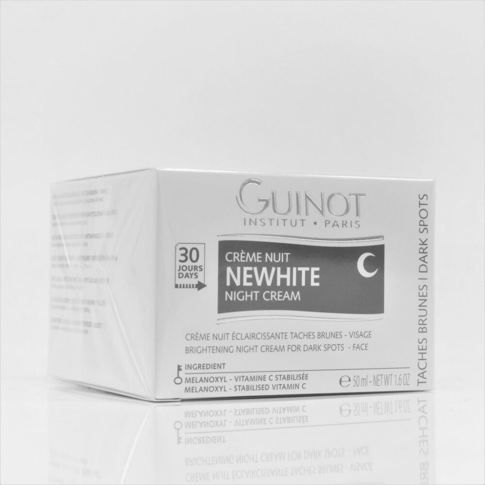 Trattamento quotidiano crema notte 30 giorni, schiarisce la carnagione. Previene l’apparizione di nuove macchie, riducendo la produzione di melanina. Applicare dopo la detersione per 30 giorni ogni sera. La mattina comletare come trattamento la crema Jour Newhite SPF 30.